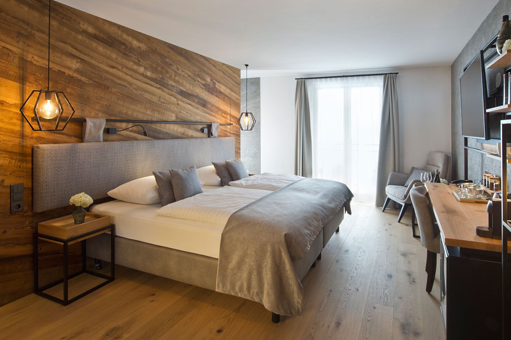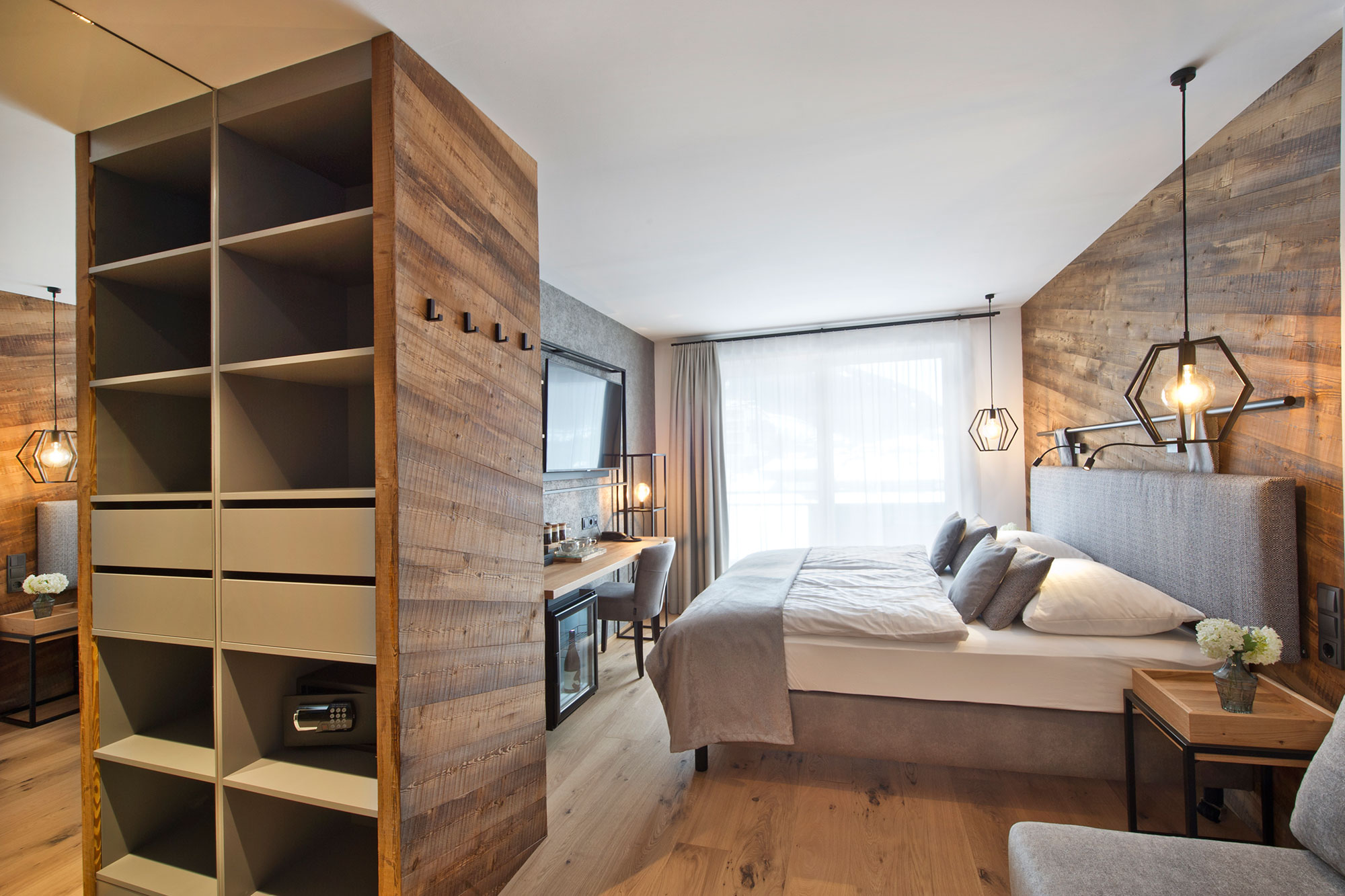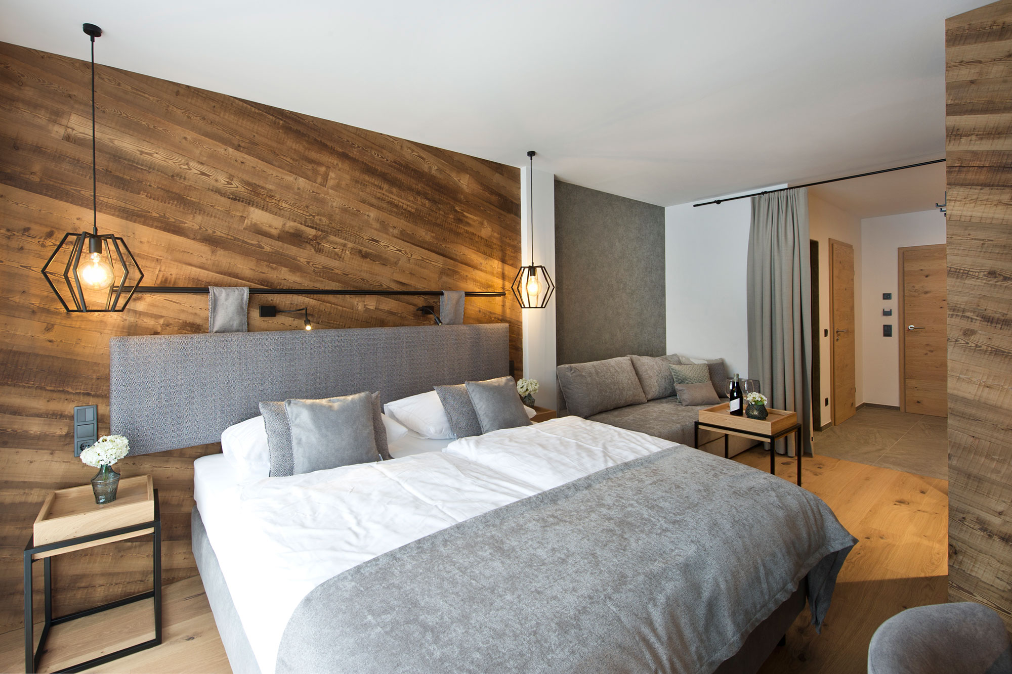 Das Doppelzimmer EDELWEISS ist mit einer Größe von 26,5 – 35 m² großzügig dimensioniert. Das angenehme Raumklima wird durch die Auswahl hochwertigster Materialen geschaffen. Holz und Naturstoffe erzeugen in Kombination mit funktionellem Design eine besondere Wohlfühlatmosphäre. Zur Einrichtung des Zimmers gehören ein Doppelbett, Telefon, Flat-TV, Safe und ein Balkon mit Blick auf das einzigartige Bergpanorama von Hinterglemm. Offenes Badezimmer mit wahlweise Bad oder Dusche, WC, Föhn.